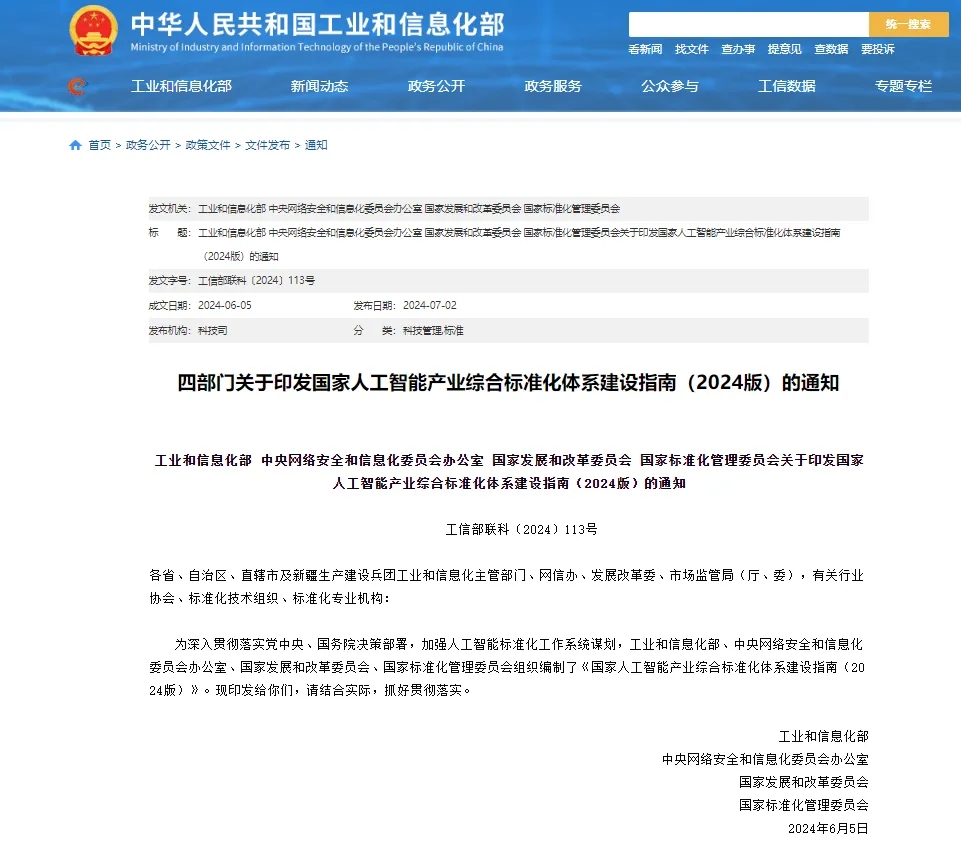 近日,工業(yè)和信息化部、中央網(wǎng)信辦、國(guó)家發(fā)展改革委、國(guó)家標(biāo)準(zhǔn)委等四部門(mén)聯(lián)合印發(fā)《國(guó)家人工智能產(chǎn)業(yè)綜合標(biāo)準(zhǔn)化體系建設(shè)指南(2024版)》,進(jìn)一步加強(qiáng)人工智能標(biāo)準(zhǔn)化工作系統(tǒng)謀劃,加快構(gòu)建滿足人工智能產(chǎn)業(yè)高質(zhì)量發(fā)展和“人工智能+”高水平賦能需求的標(biāo)準(zhǔn)體系,夯實(shí)標(biāo)準(zhǔn)對(duì)推動(dòng)技術(shù)進(jìn)步、促進(jìn)企業(yè)發(fā)展、引領(lǐng)產(chǎn)業(yè)升級(jí)、保障產(chǎn)業(yè)安全的支撐作用,更好推進(jìn)人工智能賦能新型工業(yè)化。