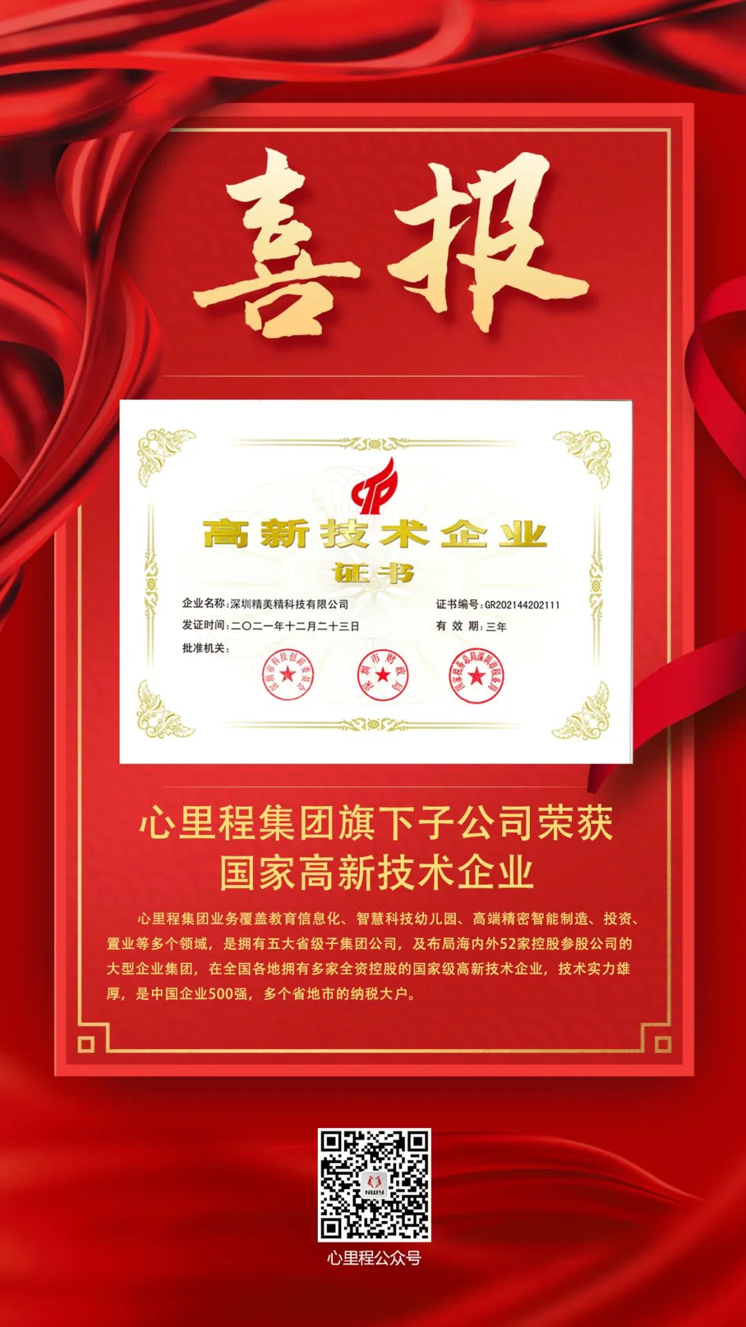 近日,心里程集團(tuán)旗下企業(yè)——深圳精美精科技有限公司榮獲國家高新技術(shù)企業(yè)認(rèn)定,表明其科技研發(fā)、持續(xù)創(chuàng)新、成長等能力均獲得國家肯定。