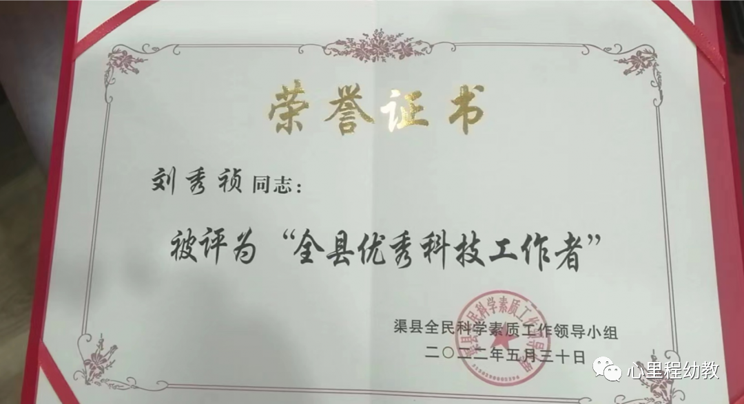 渠縣科協(xié)常委表示,心里程幼教常務(wù)副總裁劉秀禎在幼兒科技啟蒙工作方面表現(xiàn)非常優(yōu)秀,在工作崗位上無私奉獻,在創(chuàng)新育兒方向深耕多年,綻放光彩,建議表彰。