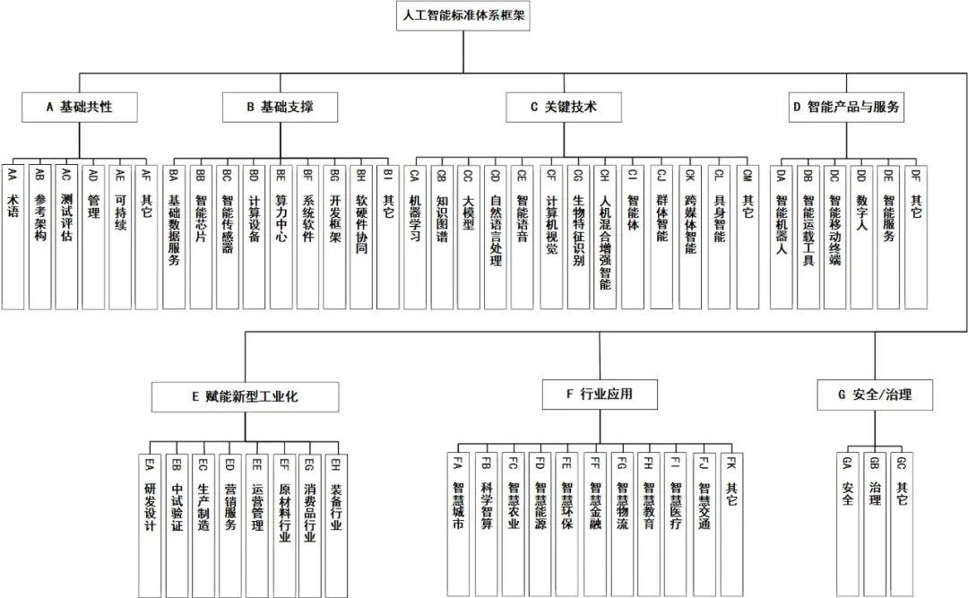 關鍵技術標準主要包括機器學習、知識圖譜、大模型、自然語言處理、智能語音、計算機視覺、生物特征識別、人機混合增強智能、智能體、群體智能、跨媒體智能、具身智能等標準。