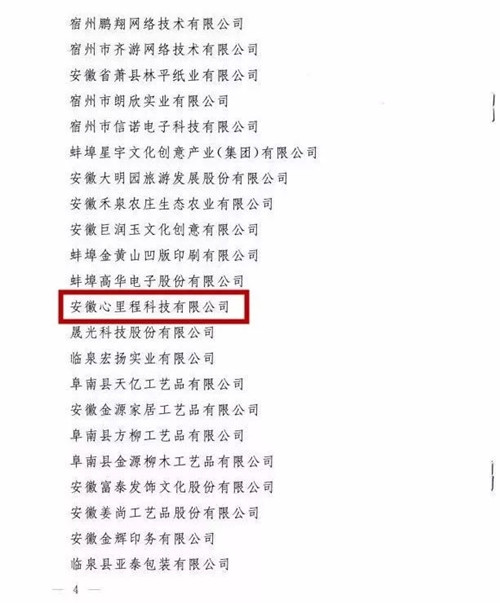 根據(jù)中共安徽省委宣傳部、安徽省文化廳、安徽省新聞出版廣電局《關(guān)于公布“2017年度安徽民營文化企業(yè)100強”名單的通知》(皖宣通字﹝2018﹞19號)的文件,安徽心里程科技有限公司成功入選“2017年度安徽民營文化企業(yè)100強”