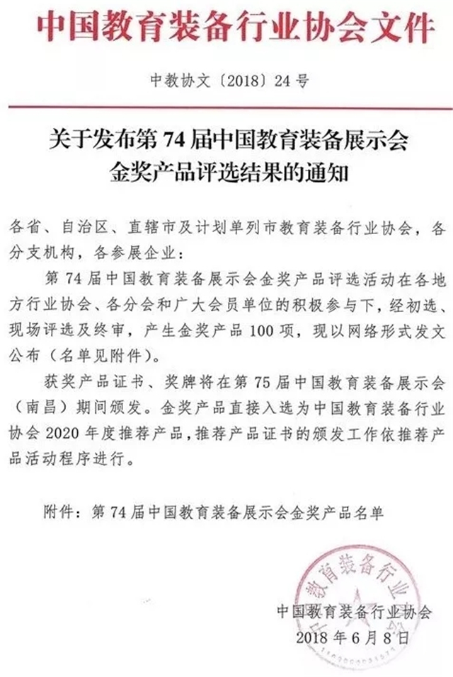 金獎(jiǎng)產(chǎn)品的獲獎(jiǎng)產(chǎn)品證書、獎(jiǎng)牌將于今年11月在第75屆中國(guó)教育裝備展示會(huì)(南昌)舉辦期間頒發(fā)。特別值得一提的是,金獎(jiǎng)產(chǎn)品將直接入選為中國(guó)教育裝備行業(yè)協(xié)會(huì)2020年度推薦產(chǎn)品。