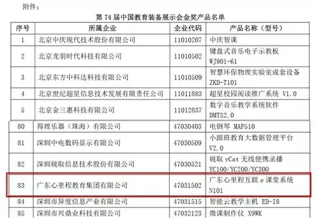 6月8日,中國(guó)教育裝備行業(yè)協(xié)會(huì)公布了“第74屆中國(guó)教育裝備展示會(huì)金獎(jiǎng)產(chǎn)品評(píng)選結(jié)果”,廣東心里程教育集團(tuán)有限公司的【廣東心里程互聯(lián)e課堂系統(tǒng)N101】榮獲金獎(jiǎng)產(chǎn)品!