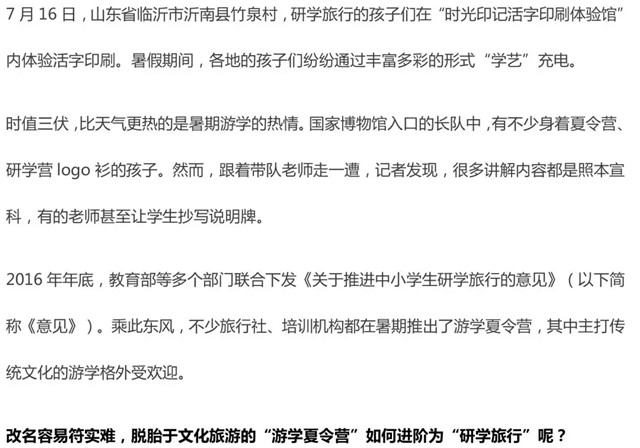 但在北京市景山學(xué)校教師朱暢思看來,游學(xué)與研學(xué)并不能畫等號。“研學(xué)組織方應(yīng)有科學(xué)的邏輯,自己要設(shè)計活動、給孩子講解、帶著孩子們總結(jié)。否則,就只是個旅游、玩樂的組織者了。”