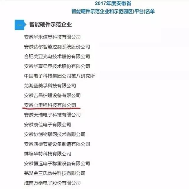?2017年,安徽心里程科技有限公司躋身2017年度安徽省智能硬件示范企業(yè)。
