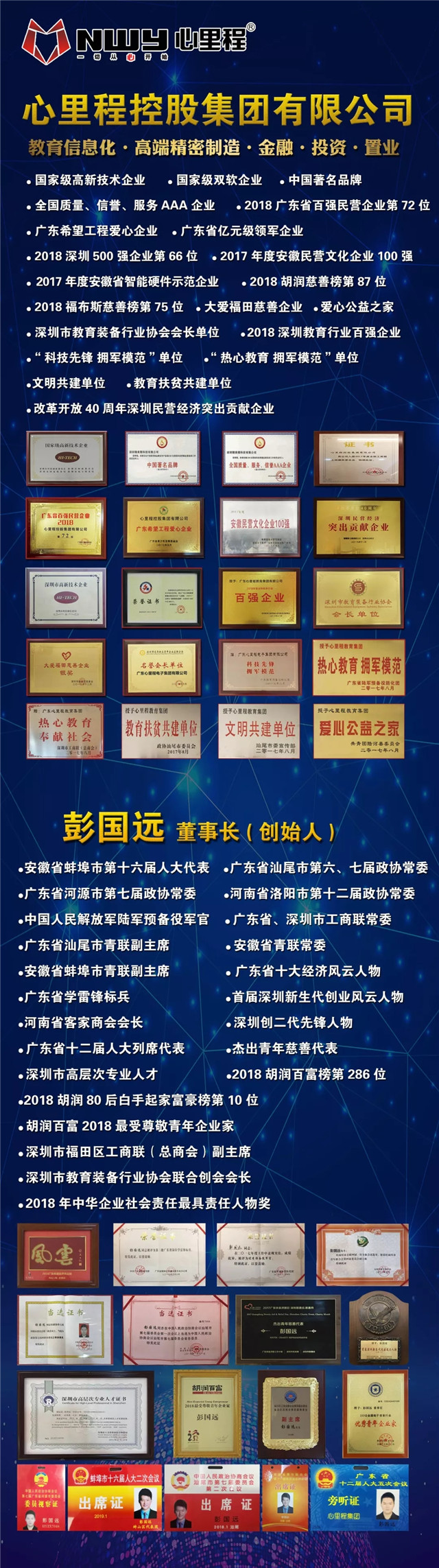 自創(chuàng)業(yè)以來,彭國遠(yuǎn)董事長一直秉承“一切從心開始”的經(jīng)營理念,以務(wù)實的作風(fēng)及創(chuàng)新的精神,不斷進(jìn)取,拼博向上,創(chuàng)造百億集團(tuán)心里程。目前心里程集團(tuán)已擁有4個省級集團(tuán)子公司,數(shù)十家控股參股公司,并在全國多個省市建立了區(qū)域總部經(jīng)濟(jì)及產(chǎn)業(yè)園,產(chǎn)業(yè)涉及教育信息化、高端精密制造、金融、投資、置業(yè)等領(lǐng)域,并榮獲“國家級高新技術(shù)企業(yè)”、“國家級雙軟企業(yè)”、“2018年廣東省百強民營企業(yè)”、“2018深圳500強企業(yè)第66位”等多項榮譽。
